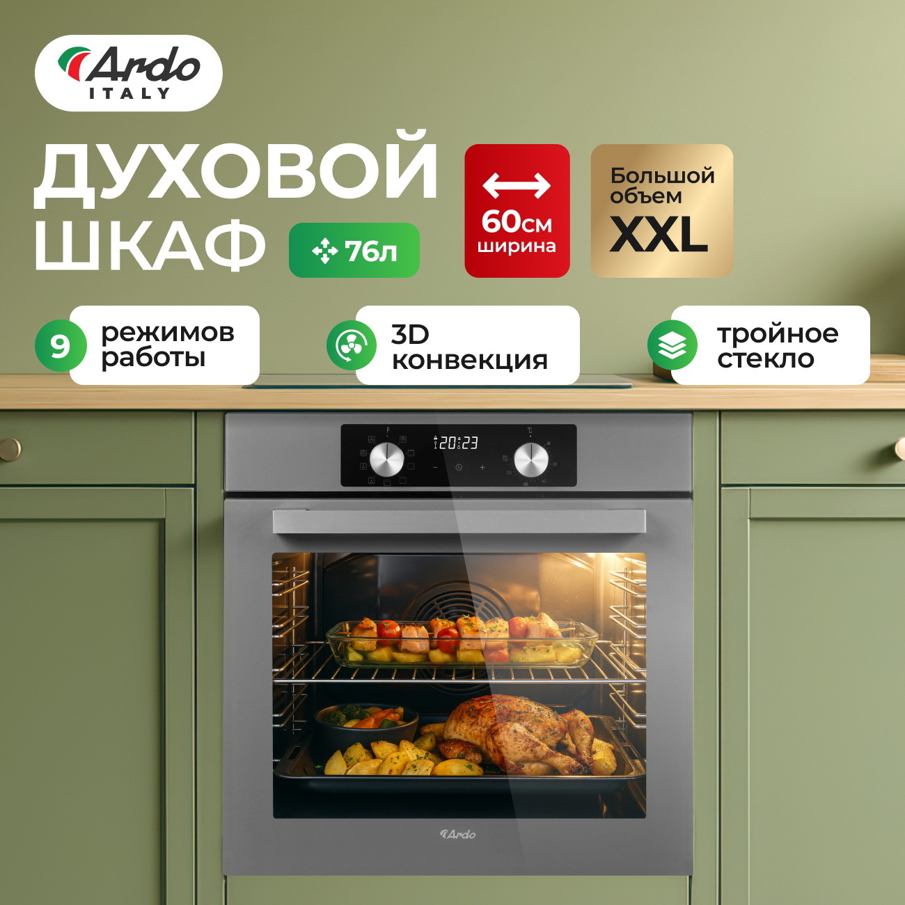 Встраиваемый духовой шкаф Ardo – идеальное решение для современной кухни, сочетающее в себе стильный дизайн и высокую функциональность. С объемом 76 литров, этот электрический духовой шкаф предоставляет достаточно места для приготовления больших блюд и выпечки. Данная модель предлагает 9 различных режимов нагрева, что позволяет вам экспериментировать с кулинарными рецептами и выбирать оптимальные настройки для каждого блюда. Встроенная функция гриля делает его одним из лучших решений для создания аппетитных корочек и запеканок. Особенно приятно, что духовой шкаф оснащен системой конвекции, которая обеспечивает равномерное прогревание и пропекание ингредиентов, избавляя от необходимости переворачивать блюда во время готовки. Одним из ключевых преимуществ является тройное остекление дверцы, которое гарантирует высокий уровень изоляции и безопасность во время использования. Вы можете не беспокоиться о перегреве внешней поверхности, что особенно важно, если у вас есть маленькие дети. Съемные стекла упрощают процесс чистки, позволяя вам поддерживать устройство в идеальном состоянии без лишних усилий. Ширина 60 см делает этот встраиваемый духовой шкаф совместимым с большинством кухонных гарнитуров, а его стильный внешний вид легко вписывается в любой интерьер. Удобное управление и понятная панель управления обеспечивают легкость в использовании, даже для тех, кто не имеет большого опыта в приготовлении блюд.