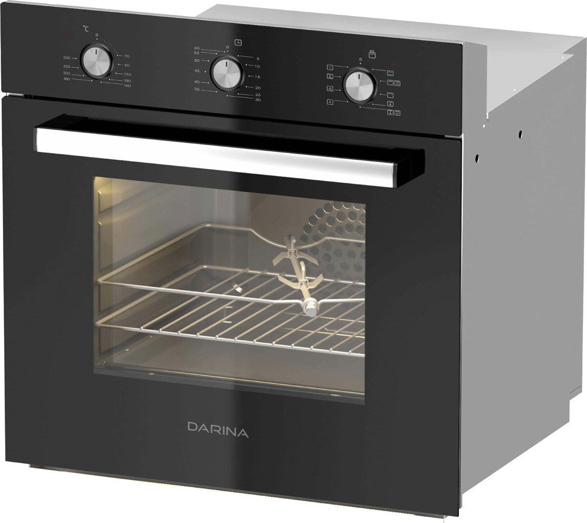 электрическим грилем и вертелом. 4 пары штампованных направляющих дают возможность разместить несколько противней одновременно. В комплекте с духовым шкафом прилагается решётка и набор из двух эмалированных поддонов.