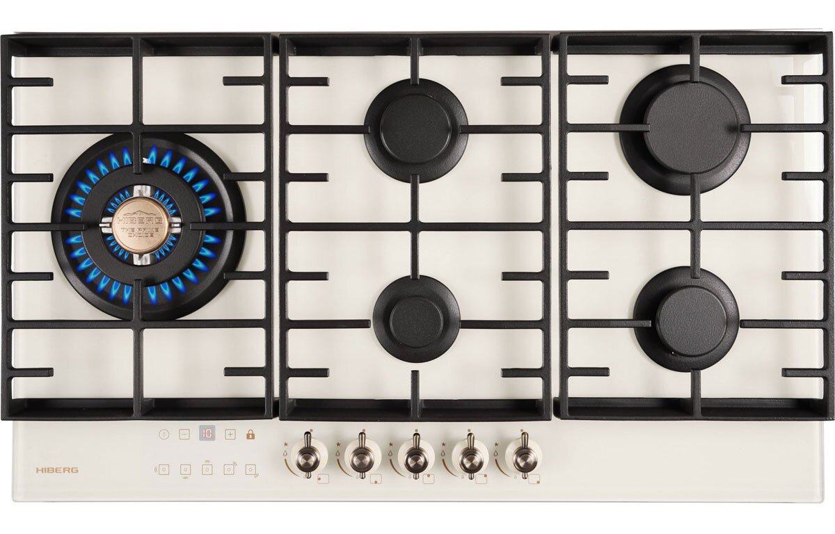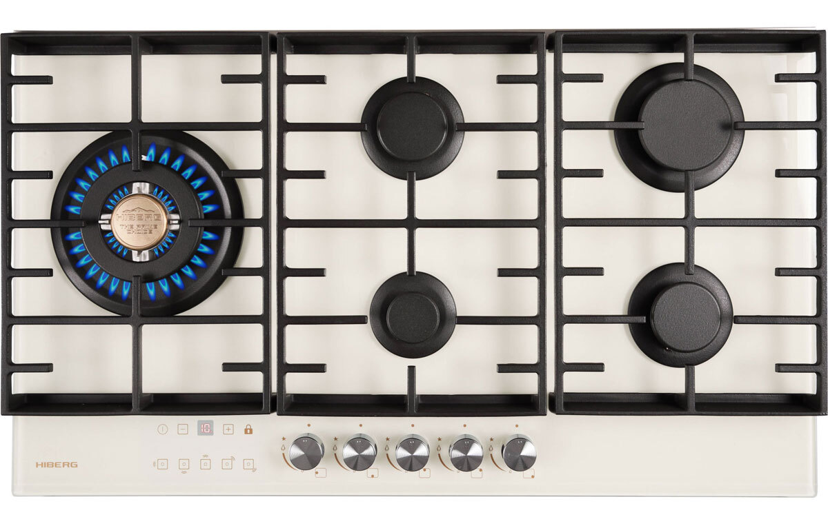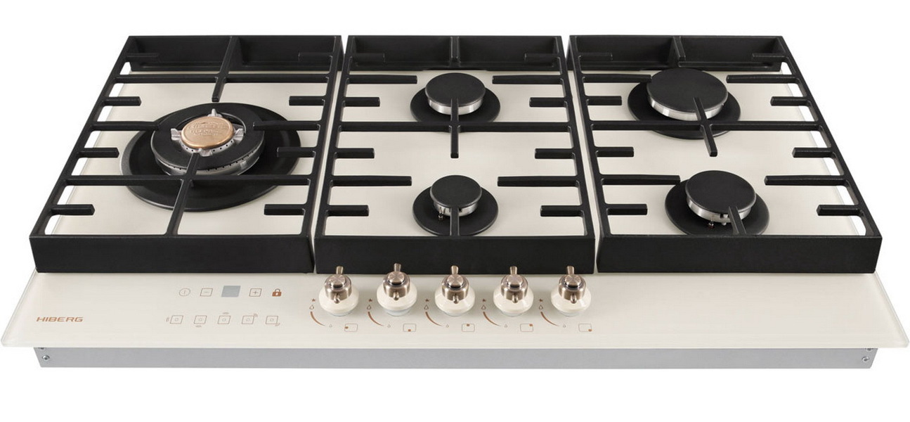 Встраиваемая газовая варочная поверхность HIBERG VM 9155 Y из закаленного стекла в бежевом цвете и ретро-стиле, оснащена 5 конфорками и функциями: автоматический «электророзжиг», «газ-контроль» и сенсорный таймер отключения. В комплект варочной поверхности входит дополнительный набор ручек регуляторов в современном стиле