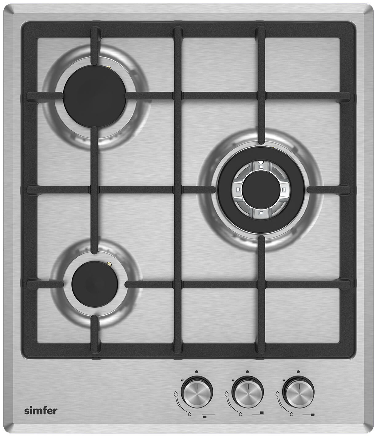 Устройство оснащено тремя конфорками. В правую сторону вынесены самая мощная зона (2,5 кВт), с тремя рядами пламени. Это позволит, например, готовить в воке – большая сковорода будет стоять устойчиво и равномерно прогреваться, не мешая другой посуде. Передняя левая горелка – малая (1 кВт), дальняя – средняя (1,75 кВт).