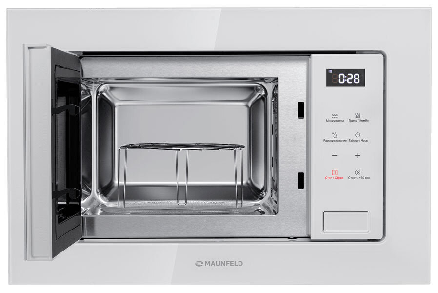 Микроволновая печь MAUNFELD MBMO820SGB10 комбинированного типа. Можно использовать только микроволны, только гриль или и то, и другое вместе. В СВЧ можно размораживать продукты по весу и времени. Мыть прибор вручную необязательно, для этого есть система очистки паром с помощью микроволн.