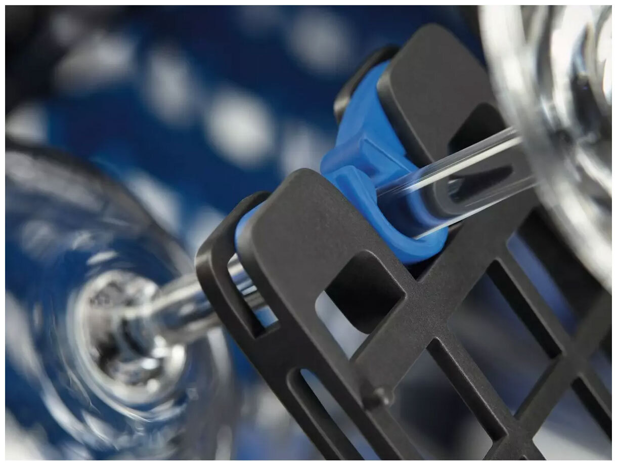 Особенности верхней корзины: с регулировка положения по высоте, резиновые держатели для бокалов