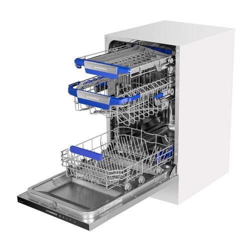 2 корзины для посуды (верхняя регулируемая по высоте с голубым пластиком), выдвижной лоток для столовых приборов