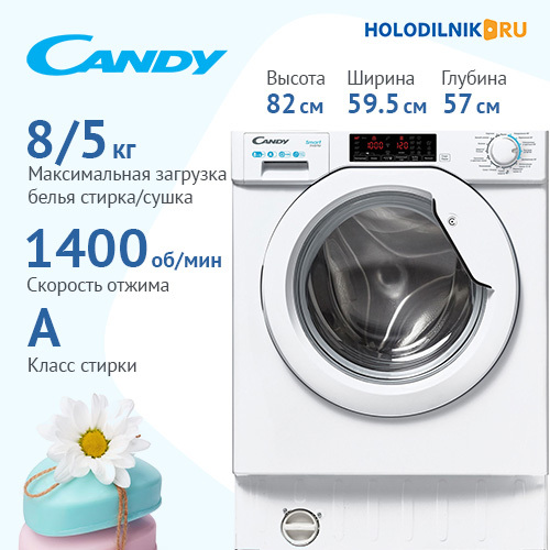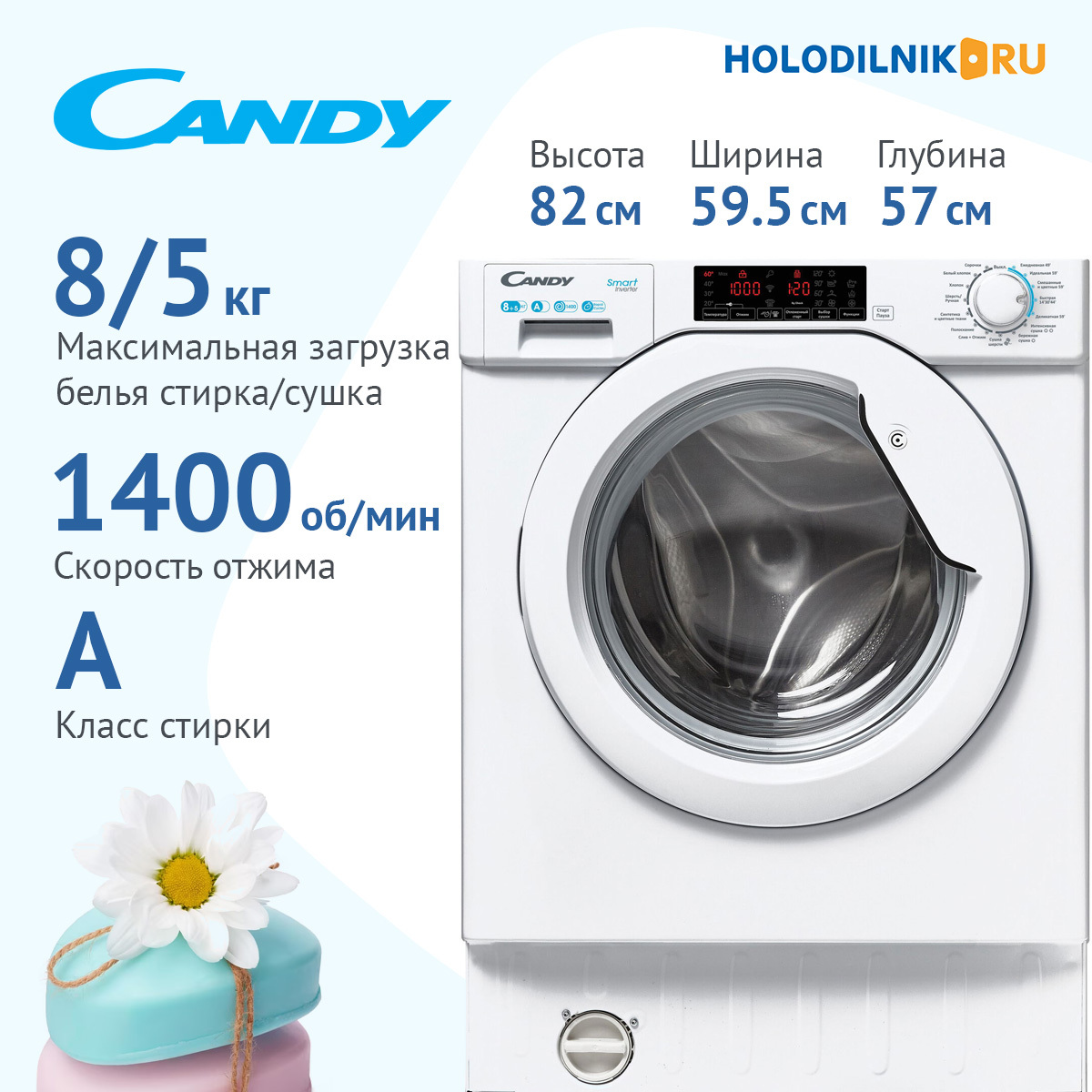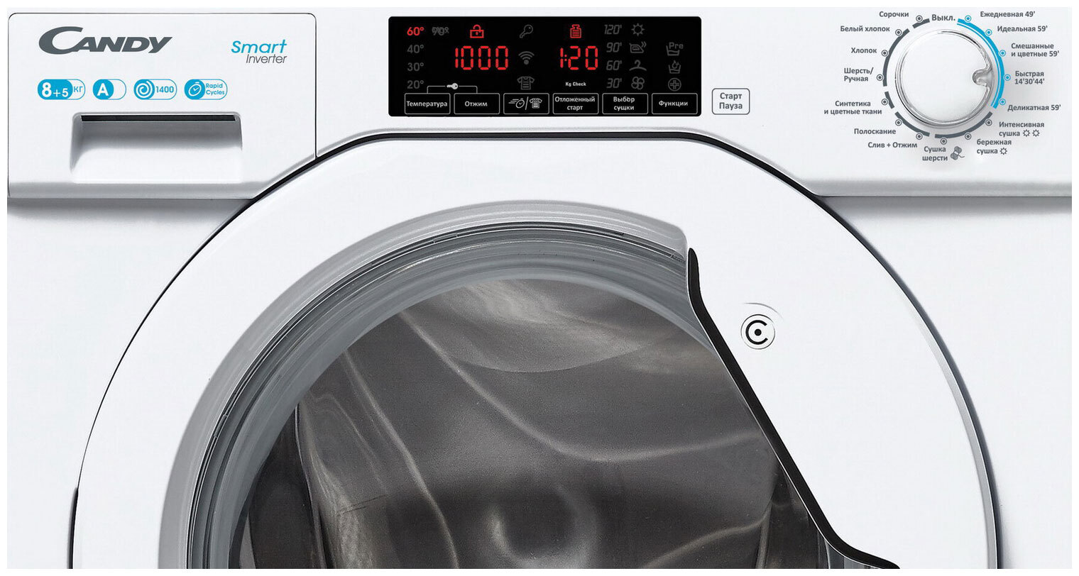 Cтирально-сушильная машина Candy Smart CBD 485TWM/1-07 (арт. 31801036) с загрузкой до 8 кг в режиме стирки и до 5 кг в режиме сушки.