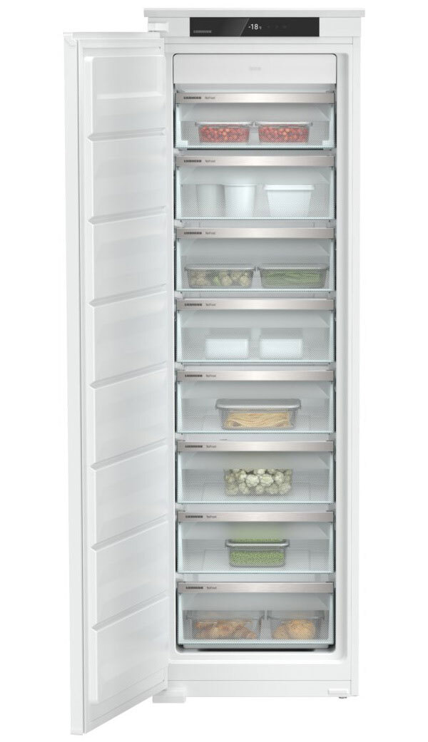 Встроенные направляющие всегда обеспечивают удобный доступ к Вашим продуктам при открытых и загруженных выдвижных контейнерах морозильного отделения. Ограничитель выдвижения предотвращает их выпадение. При задвижении выдвижные контейнеры без усилий перемещаются в оптимальное конечное положение, что обеспечивает правильное распределение воздуха перед выдвижными контейнерами и, следовательно, оптимальное охлаждение.