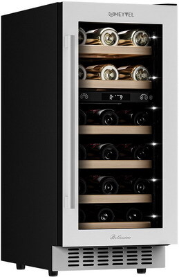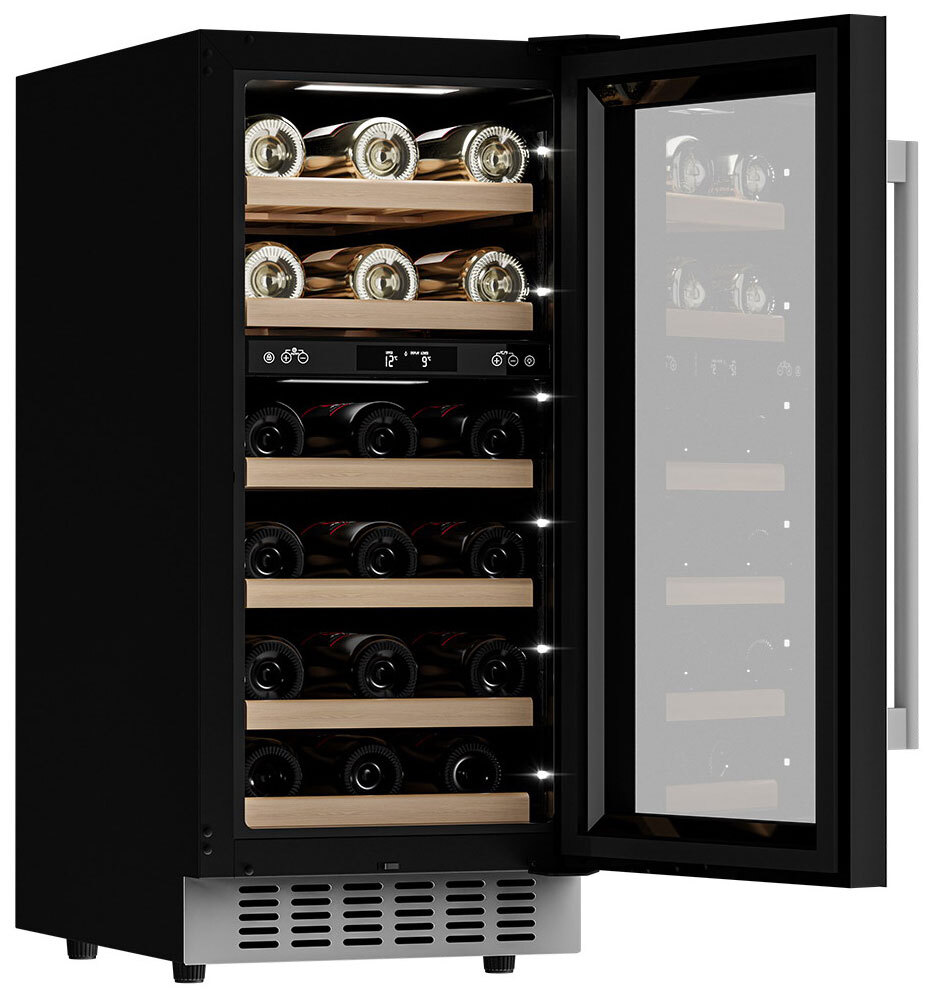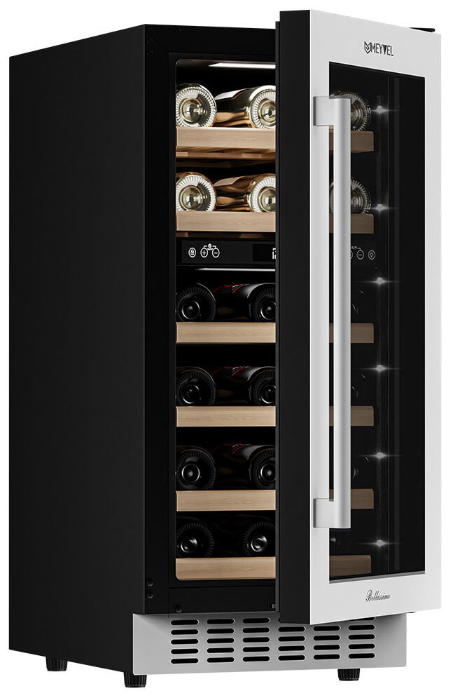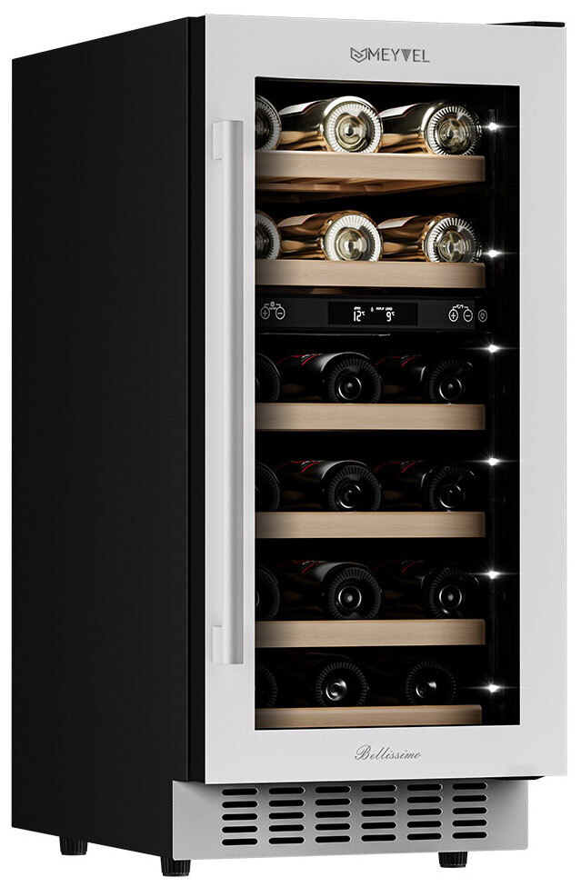 Компрессорный винный шкаф Meyvel MV28-KWT2 обладает большой вместимостью и даёт возможность разместить до 28 бутылок стандартного типа Бордо (0,75 л). Располагаются они на выдвижных полках из дерева. Внутреннее пространство шкафа разделено на 2 температурные зоны, с возможностью настраивать каждую из них. Общий диапазон температуры у данной модели от +5°C до +20°C.